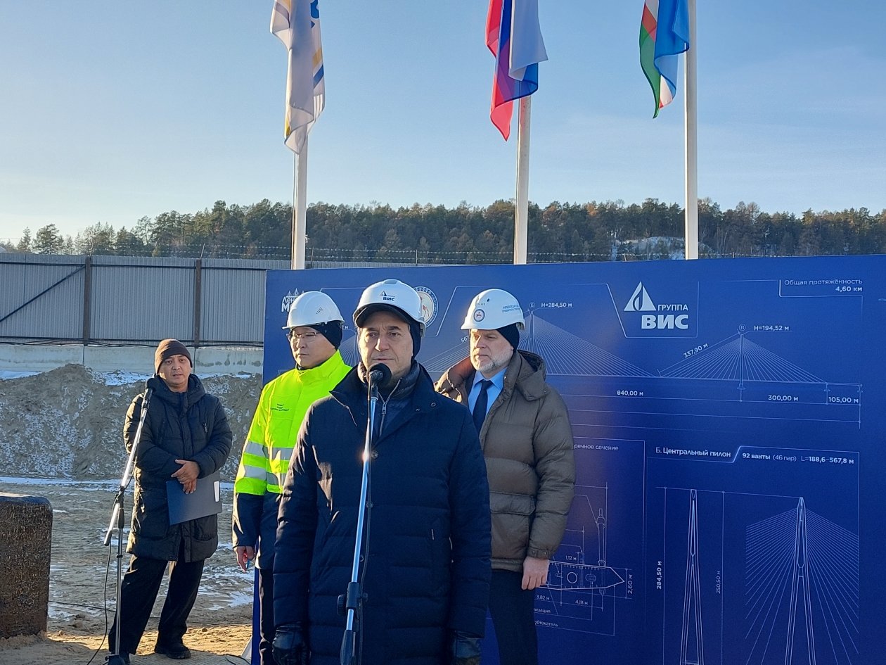 "С опоры № 4 начнется установка всех бетонных сооружений Ленского моста, в том числе пролетов, которые появятся в следующем году. Это не элемент конструкции, а постоянная часть моста. Нигде таких объектов пока не возводилось — это большая заслуга тех, кто работает над реализацией этого сложнейшего мостового перехода. Он будет символом нашей республики. С точки зрения масштаба строительных размеров мы знаем, что средняя часть, средний пилон — это будет самая высокая точка моста — 284,5 метра. Протяженность моста составит 4,6 км. Не так давно объект посетил зампред правительства Российской Федерации — полномочный представитель президента Российской Федерации в Дальневосточном федеральном округе Юрий Петрович Трутнев, который оценил ход строительных работ и отметил, что на таком непростом объекте все работы идут по плану. Добавлю, что реализация проекта стоит на контроле Владимира Путина, по его поручениям и поставленным срокам мы все отрабатываем по плану".