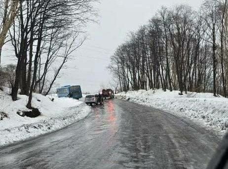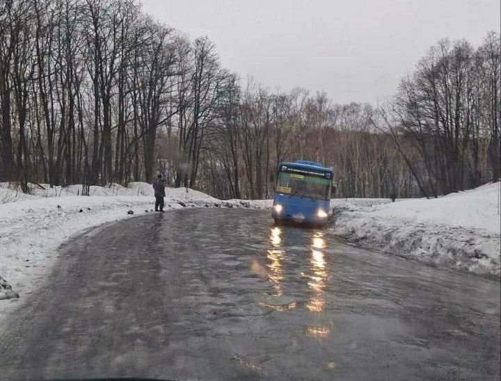 На дороге в Нагорный — ледяная гора. И автомобили, и общественный транспорт с нее просто сносит.