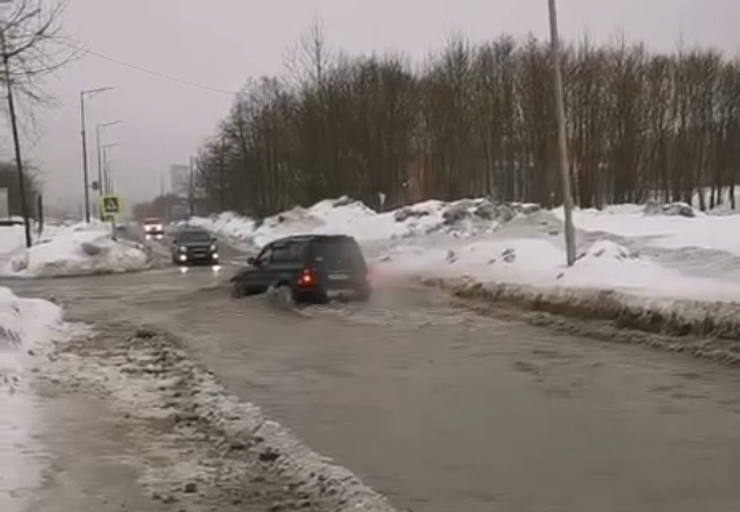 В микрорайоне Северо-Восток на дорогах образовались гигантские лужи-озёра, из которых машины выбираются с большим трудом.