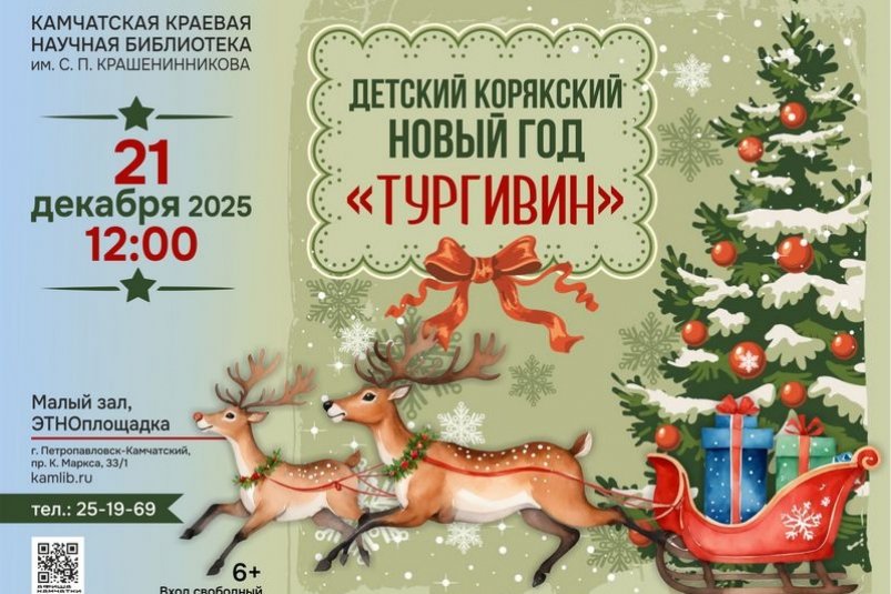 KamchatkaMedia, 19 декабря. В Камчатской краевой библиотеке им С.П. Крашенинникова в воскресенье, 21 декабря, с 12.00 до 15.00 состоится праздник "Тургивин" (6+). Юных гостей ждёт знакомство с обрядами, героями корякских сказок, участие в национальных играх и конкурсах, сообщает ИА KamchatkaMedia со ссылкой на организаторов мероприятия.