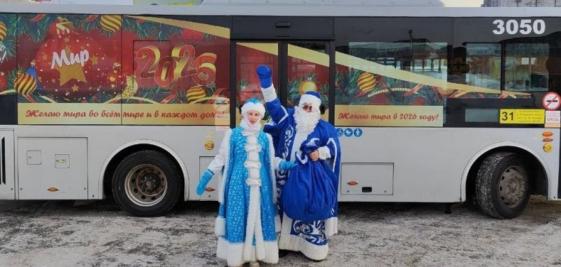 "В брендированных автобусах городского Автопарка пассажиров будут встречать Дед Мороз и Снегурочка. Волшебные гости подготовили для пассажиров творческие номера. Для каждого из них приготовлено поздравление и сувенир", — рассказали в Управлении культуры, спорта и молодежной политики администрации города.