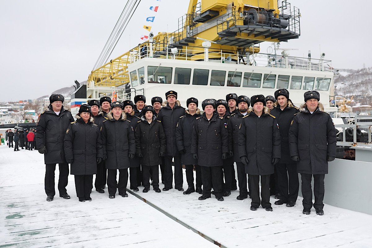 "Наша страна и наш Военно-морской флот передали нам на Камчатку это судно для того, чтобы мы могли поддерживать боевую готовность подводных лодок и кораблей, несущих службу на восточных рубежах России!", — открыл вступительным словом торжественный митинг заместитель командующего Войсками и Силами на Северо-Востоке России контр-адмирал Евгений Мясоедов. Он довел приказ Главнокомандующего Военно-морским флотом Российской Федерации о зачислении нового судна в состав ВМФ и вручил флаг судов вспомогательного флота капитану-кранмейстеру СПК-150 Максиму Гончарову.