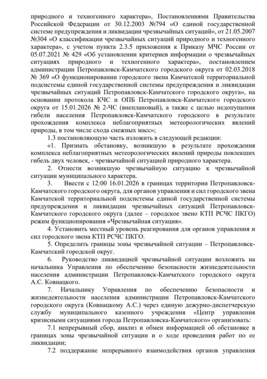 — Внесены изменения в Постановление администрации города № 5 от 15 января о признании обстановки в границах Петропавловск-Камчатского городского округа чрезвычайной ситуацией, — поясняет мэр.