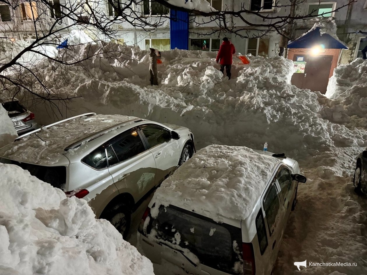 Обычный двор в Петропавловске-Камчатском. Последний раз снег убирали в середине декабря. После всех циклонов проезд полностью заблокирован уже две недели. Невозможно вывезти мусор, проехать пожарным и скорой, подвести товары в окрестные магазины. Попытка погрузчика пробиться в соседний двор закончилась крахом — спецтехника чуть не свалилась в яму со свежеоткопанным автомобилем, а потом превратила въезд в площадку для могула с трамплинами и ухабами.