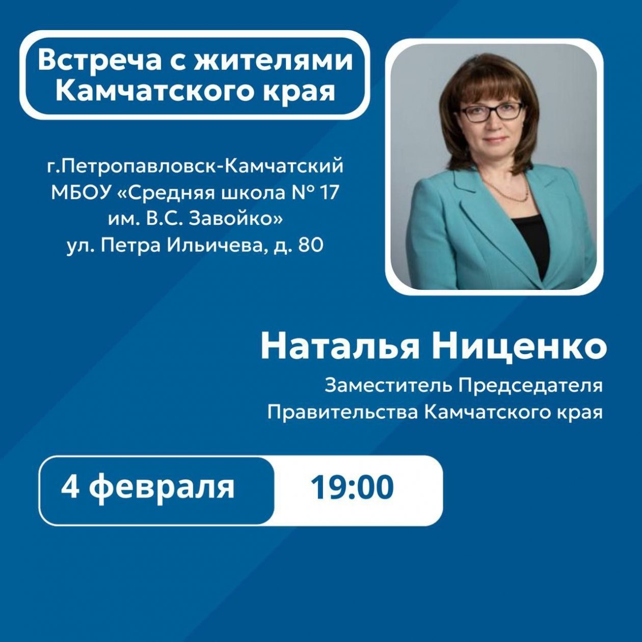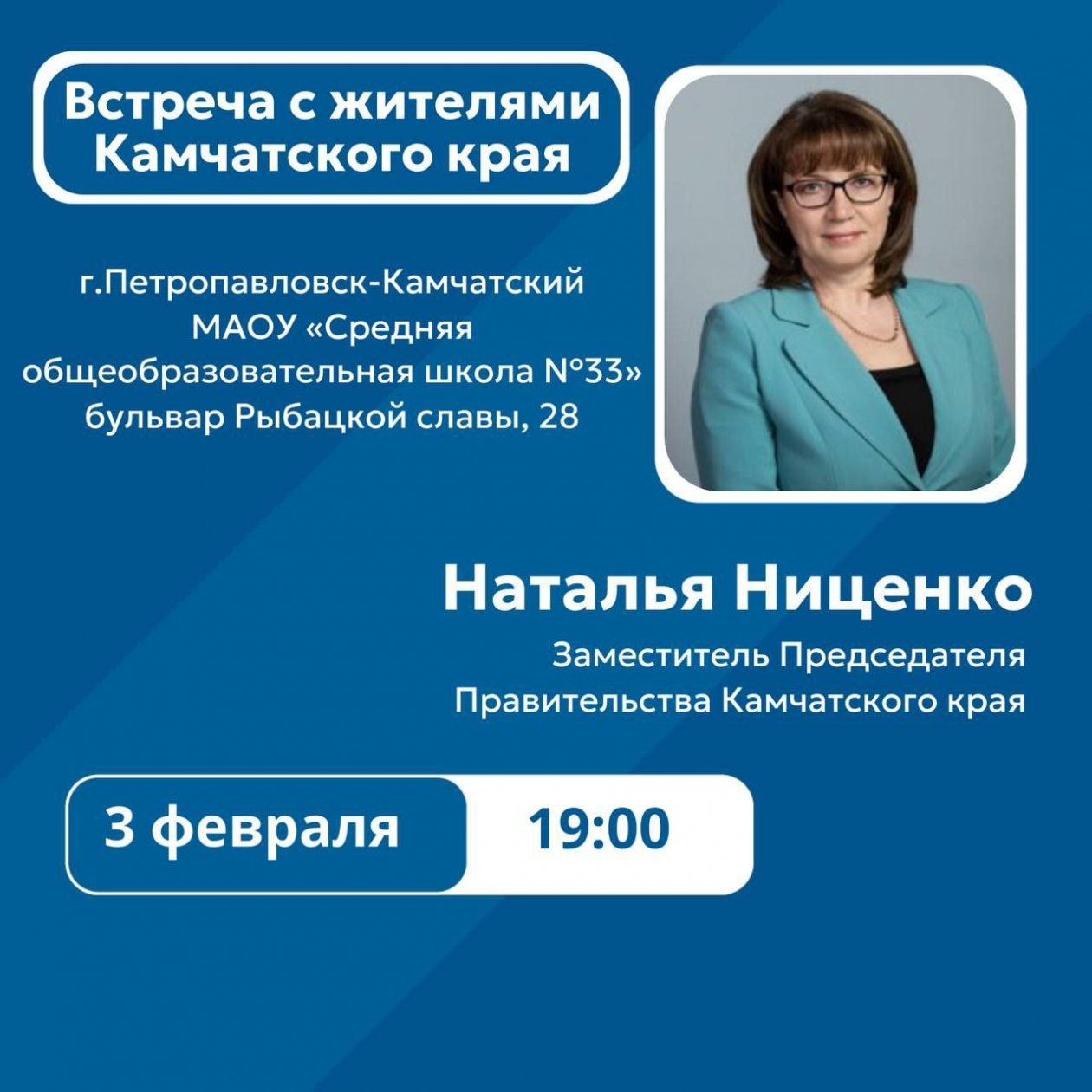 Две встречи проведет зампред правительства Камчатского края Наталья Ниценко. Первая состоится 3 февраля в 19 часов в школе № 33 (Бульвар Рыбацкой славы, 28), вторая – 4 февраля в 19 часов — в школе № 17 (Завойко, ул. Петра Ильичева, 80)