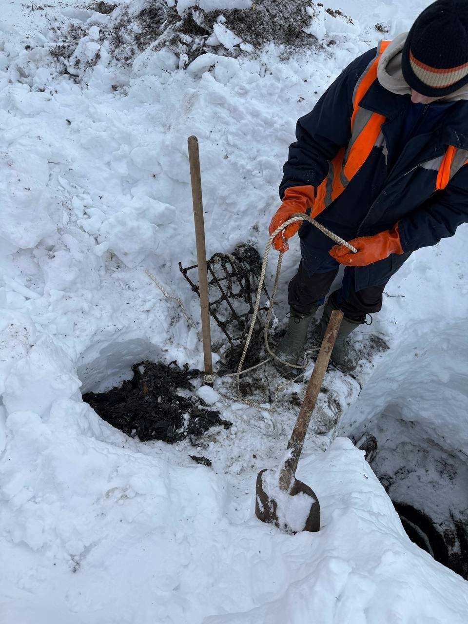 Накануне специалисты водоканала до 4 часов утра устраняли аварийную ситуацию. Ликвидацию аварии затрудняет значительный слой снега, под которым находятся канализационные колодцы.