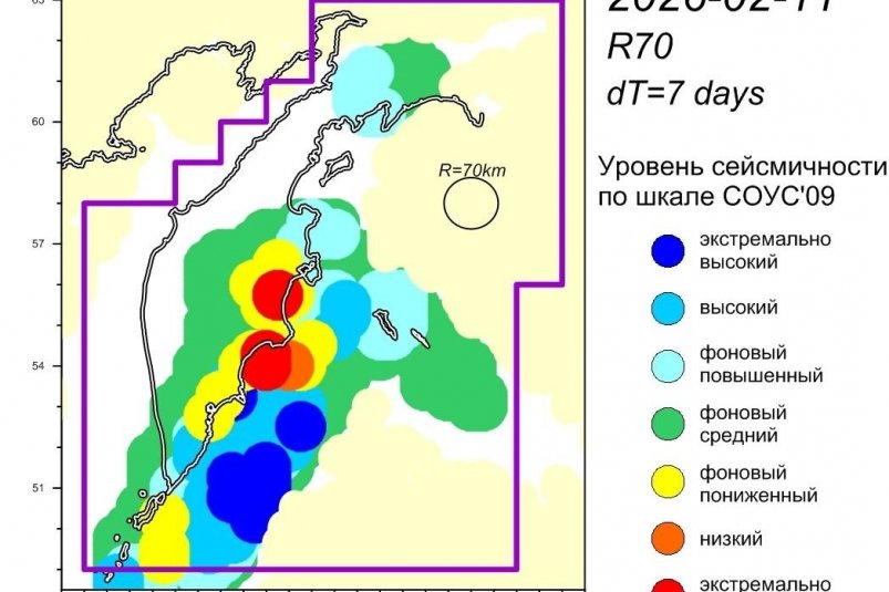 Уровень сейсмичности Камчатского участка зоны субдукции (по состоянию на 11 февраля 2026 г.) определяют как фоновый повышенный по шкале СОУС"09. Таким же он был и неделей ранее.