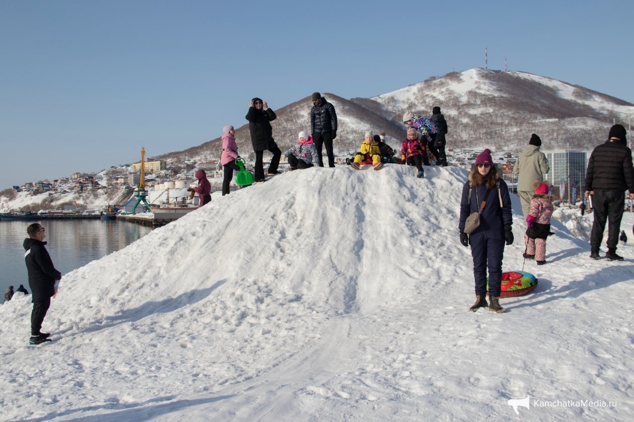 Помимо официальных развлечений были здесь и те, что люди создали для себя сами. Например, снежная горка из сугроба с видом на Авачинскую бухту и традиционное наблюдение за утками и кидание камней в воду. Погода, к слову, не подвела и подарила горожанам на редкость спокойную воду бухты.