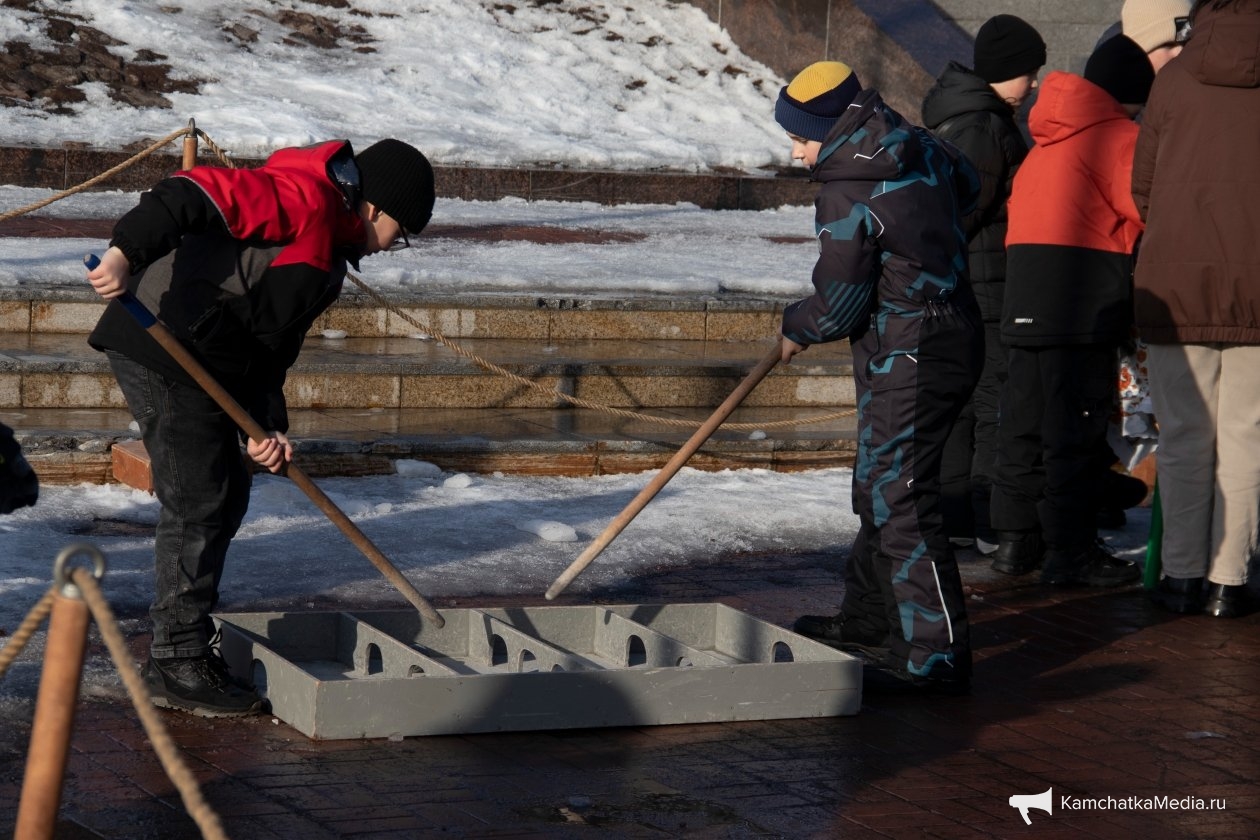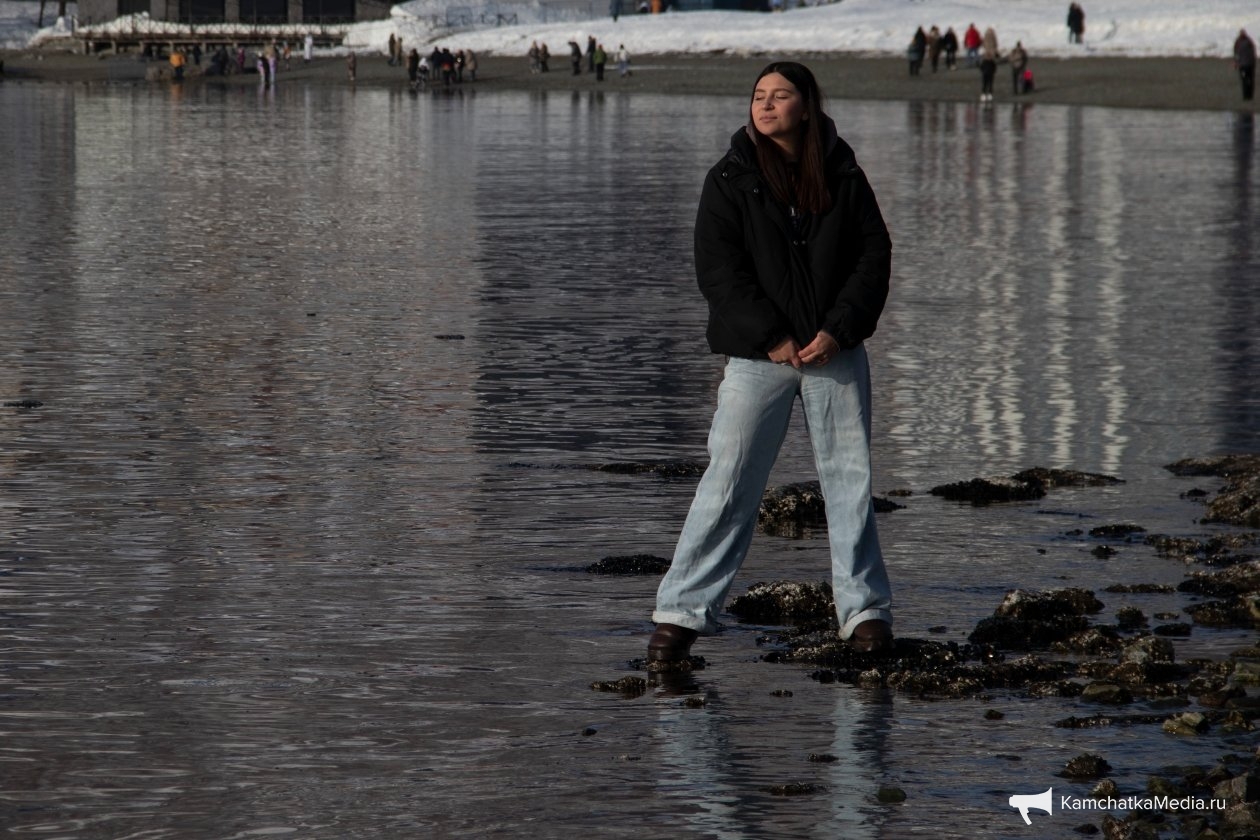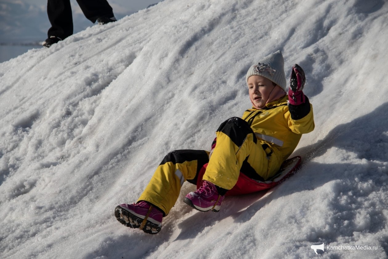 Помимо официальных развлечений были здесь и те, что люди создали для себя сами. Например, снежная горка из сугроба с видом на Авачинскую бухту и традиционное наблюдение за утками и кидание камней в воду. Погода, к слову, не подвела и подарила горожанам на редкость спокойную воду бухты.