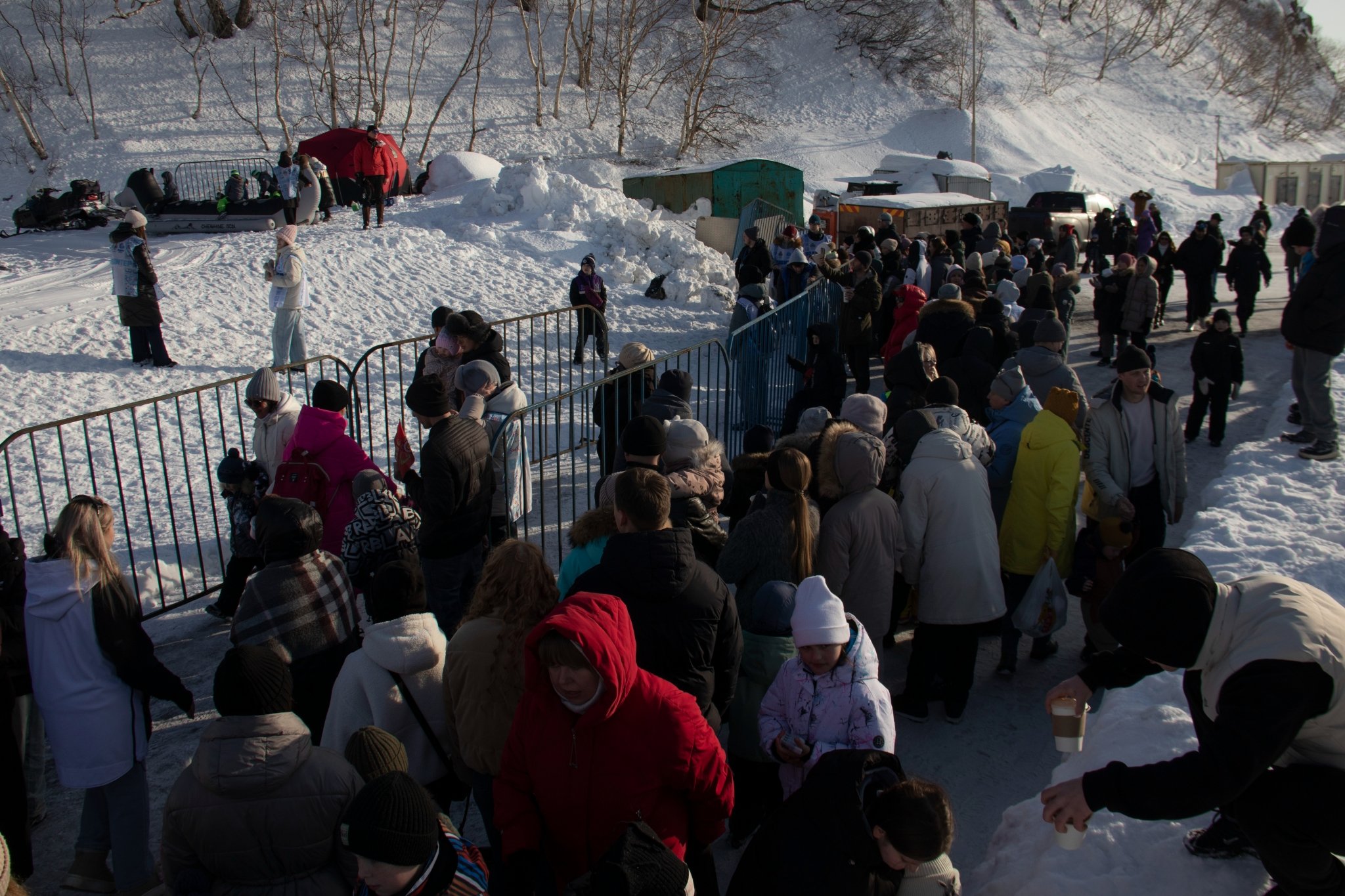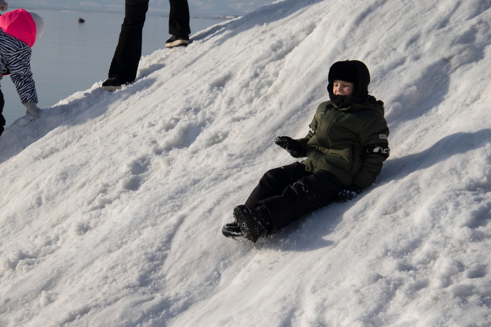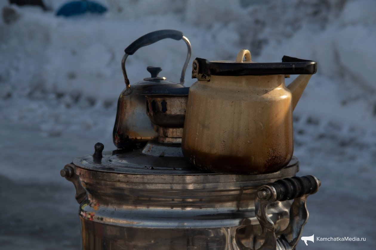 Помимо официальных развлечений были здесь и те, что люди создали для себя сами. Например, снежная горка из сугроба с видом на Авачинскую бухту и традиционное наблюдение за утками и кидание камней в воду. Погода, к слову, не подвела и подарила горожанам на редкость спокойную воду бухты.