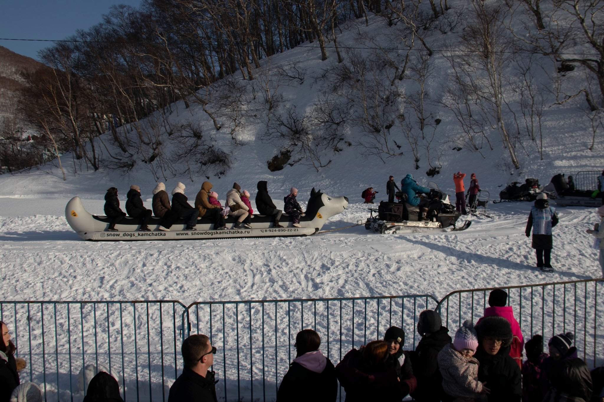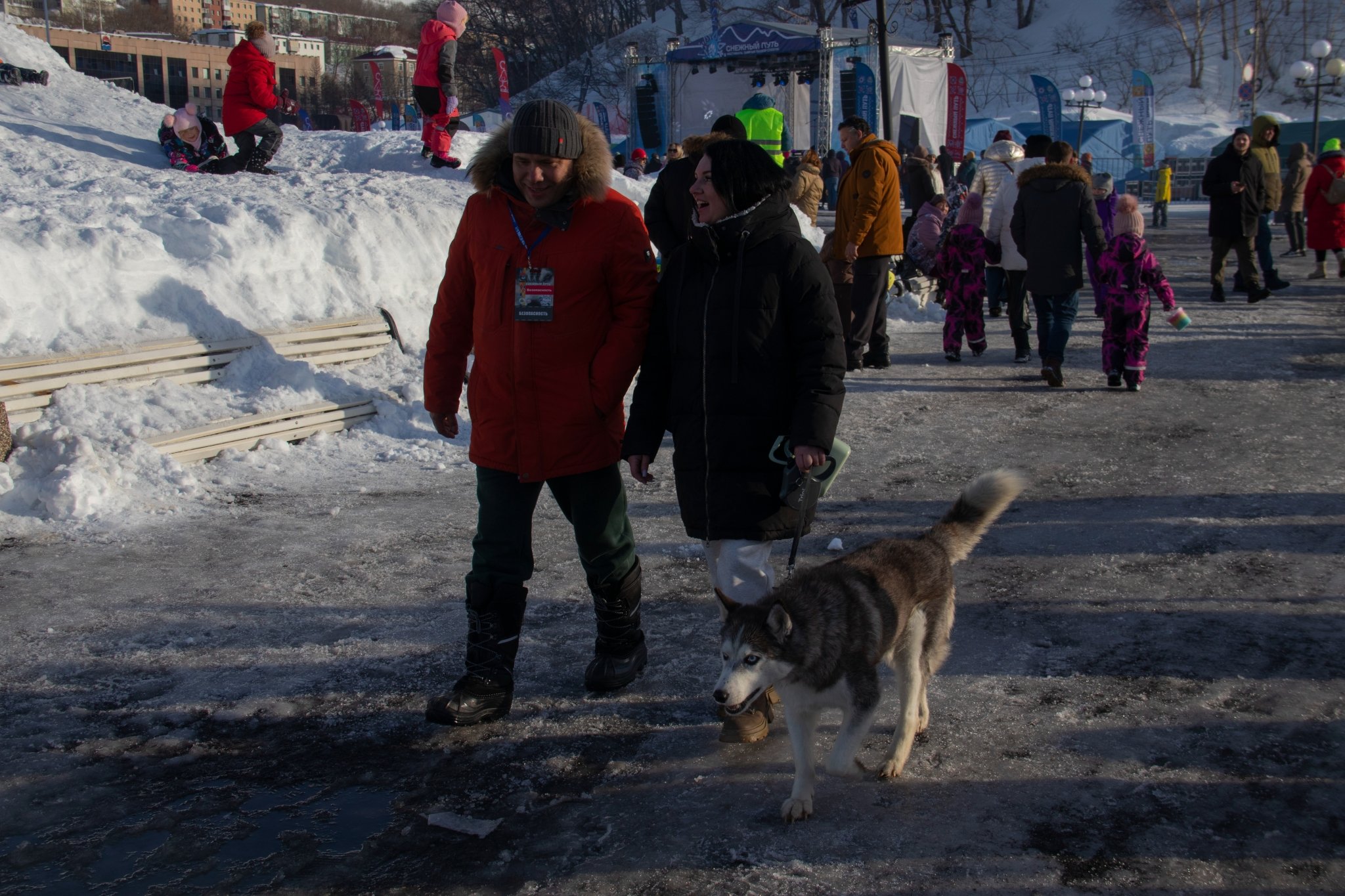 Также на площадке за сценой гости могли познакомиться с собаками и прокатиться на собачьих упряжках(6+) или снежном банане (6+). Правда, для того, чтобы получить эмоции нужно было выстоять немаленькую очередь.