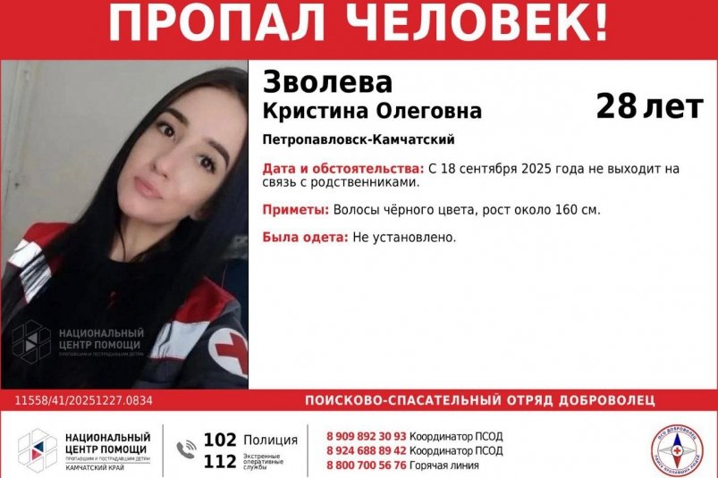 KamchatkaMedia, 26 февраля. В столице Камчатки продолжаются поиски 28-летней Кристины Олеговны Зволевой, которая не выходит на связь с родными уже более 5 месяцев, сообщили в ПСО "Доброволец".