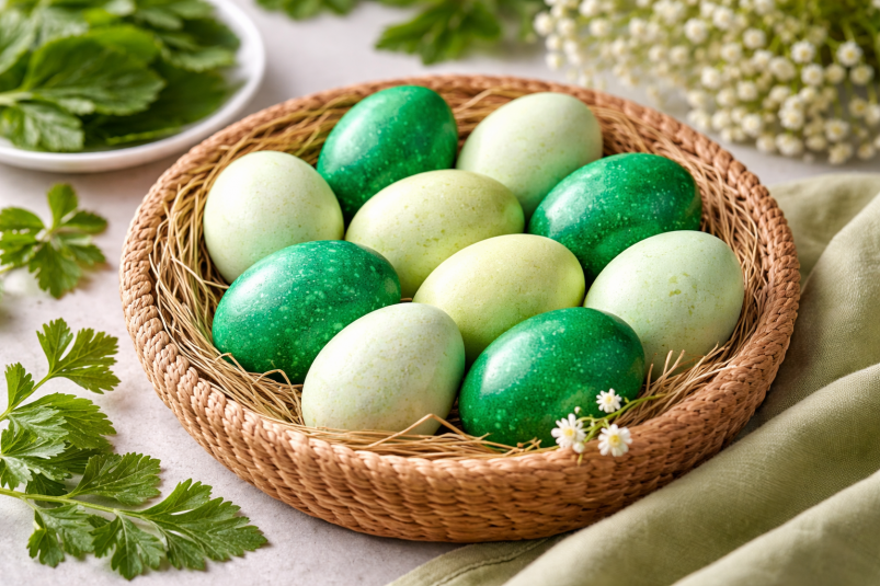 Шпинат — простой и доступный способ получить нежные зелёные пасхальные яйца. Натуральный оттенок смотрится аккуратно и подходит для спокойного