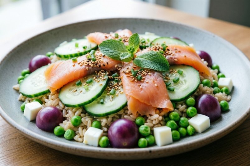 Разогрейте духовку до 200 градусов, распределите рис по противню, перемешайте с соевым соусом, сладким чили и кунжутным маслом и выпекайте 35-40 минут, периодически помешивая. Приправьте лосося, поместите в отдельную форму и запекайте в духовке 15 минут. Остудите лосося, порежьте на кусочки. Остудите рис. Огурец порежьте кружочками, авокадо — кубиками. Перемешайте все ингредиенты, приготовьте заправку и полейте ею салат. Блюдо получается очень интересным, свежим, сочным, со сладковато-пряными нотками, а хрустящий рис придает ему еще больше экзотичности.