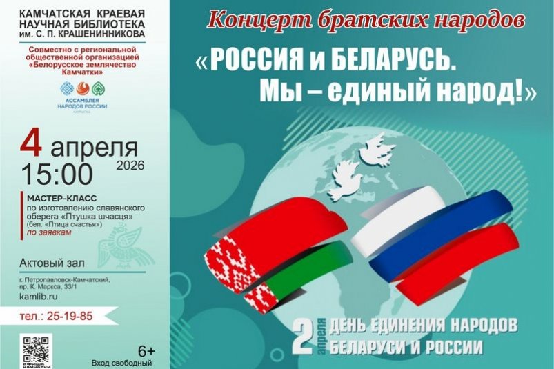 KamchatkaMedia, 2 апреля. Большая праздничная программа (6+) запланирована в главной библиотеке края в честь Дня единения народов России и Беларуси. Мероприятия пройдут уже в эту субботу, сообщается на официальном сайте Камчатской краевой библиотеки им. С.П. Крашенинникова.
