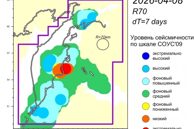 "Уровень сейсмичности Камчатского участка зоны субдукции (по состоянию на 08 апреля 2026 г.) — фоновый средний по шкале СОУС"09",