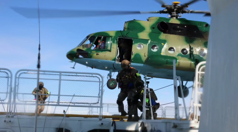 В сценарии использовался иностранный танкер, якобы захваченный "пиратами" в территориальных водах РФ. Злоумышленники высадились на него с судна "Академик Ковалёв" — морского транспорта вооружения Тихоокеанского флота. После захвата они взяли экипаж в заложники и запустили с танкера морские БПЛА для атаки пограничного корабля, прибывшего на сигнал бедствия.