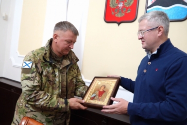 Глава Камчатки встретился с военнослужащими 40-й бригады морской пехоты Владимир Солодов передал бойцам образ святого великомученника победоносца Георгия для подземного храма в пункте временной дислокации 17 октября, 13:48