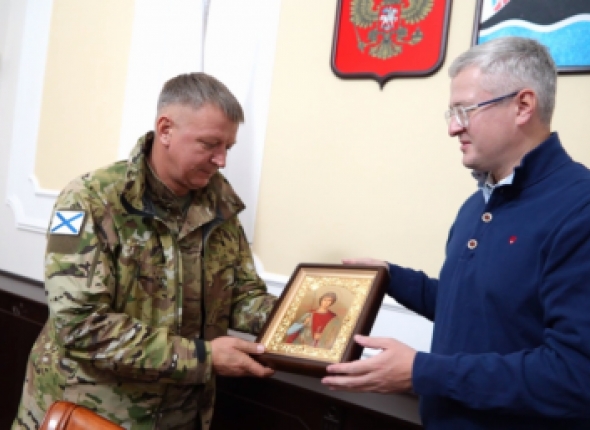 В завершении встречи губернатор передал морпехам икону, освещённую архиепископом Петропавловским и Камчатским Феодором. Святыня будет размещена в подземном храме в одном из пунктов временной дислокации в Курской области.