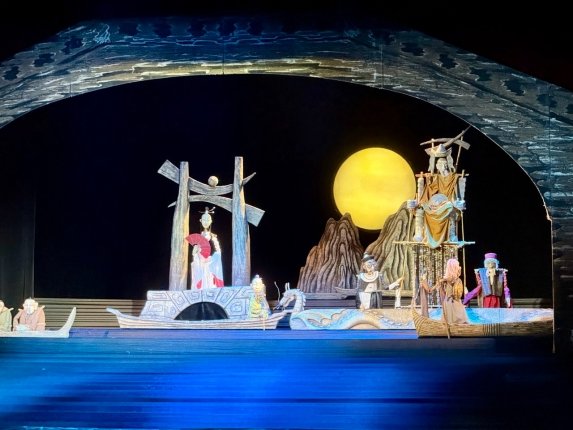 Сцена Театра драмы и комедии на несколько часов превратилась в венецианский дворик, через который, как в подзорную трубу, зрители могли видеть далёкий Китай. Там и происходило основное действие постановки сказки для театра (фьябы) Карло Гоцци.