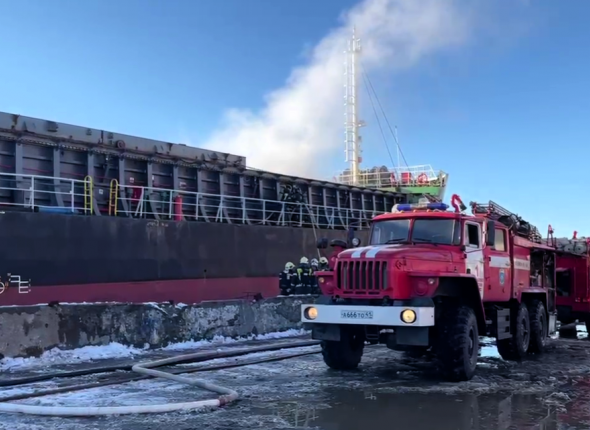 Очевидцы сообщают, что у балкера — специализированного судна для перевозки грузов насыпью — загорелся трюм.