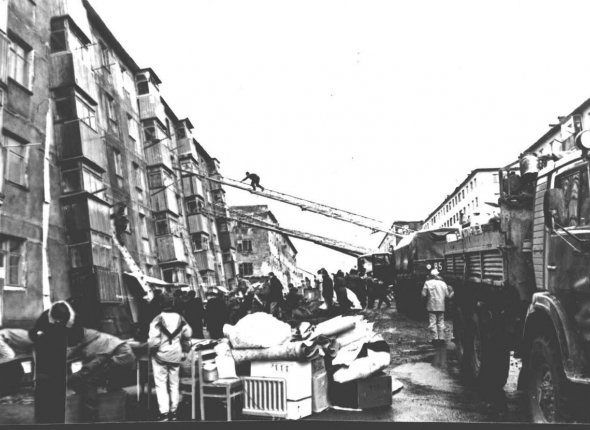 В этом доме жила моя сотрудница, которая в тот момент была в отпуске на материке. Родных в Петропавловске у неё не было. Мы сумели организовать эвакуацию и вывезли всё, что находилось в её квартире, на склад нашей организации. Часть вещей пришлось выкидывать через окна, так как в подъезде было не протолкнуться. Эвакуация постоянно прерывалась криками в мегафон: "Дом падает, всем срочно покинуть здание!", на которые в конце концов просто перестали обращать внимание,