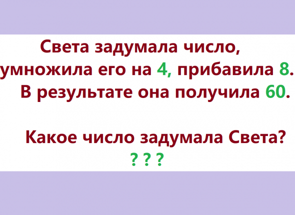Света задумала число, умножила его на 4 и к произведению прибавила 8. В итоге получилось 60. Какое число она задумала?