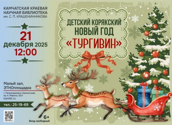 KamchatkaMedia, 19 декабря. В Камчатской краевой библиотеке им С.П. Крашенинникова в воскресенье, 21 декабря, с 12.00 до 15.00 состоится праздник "Тургивин" (6+). Юных гостей ждёт знакомство с обрядами, героями корякских сказок, участие в национальных играх и конкурсах, сообщает ИА KamchatkaMedia со ссылкой на организаторов мероприятия.