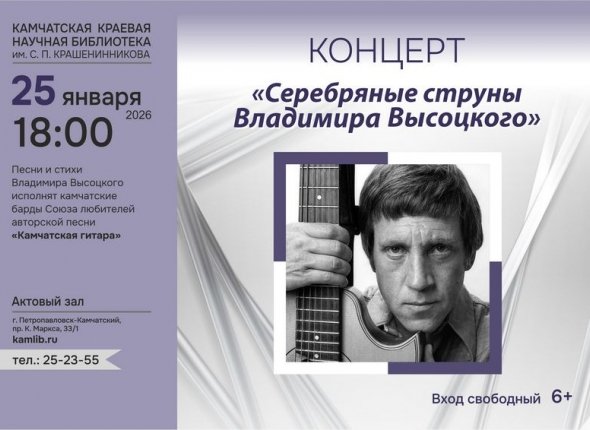 KamchatkaMedia, 19 января. На Камчатке пройдет концерт памяти Владимира Высоцкого (6+). Он состоится 25 января в 18.00 в краевой библиотеке им. С. П. Крашенинникова.