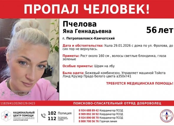 Яне Александровне Пчеловой — 56 лет. Приметы: блондинка, глаза — зеленые, рост 160 см, на лбу шрам. Была одета в бежевый комбинезон. Управляет автомобилем "Тойота-Ленд-Крузер-Прадо" белого цвета с номерами А350ХТ41.