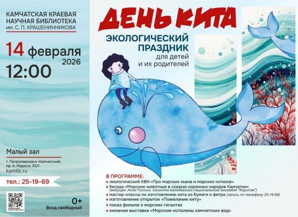 KamchatkaMedia, 10 февраля. Экологический праздник "День кита" (0+) пройдет в Камчатской краевой библиотеке имени С. П. Крашенинникова 14 февраля, сообщили организаторы.