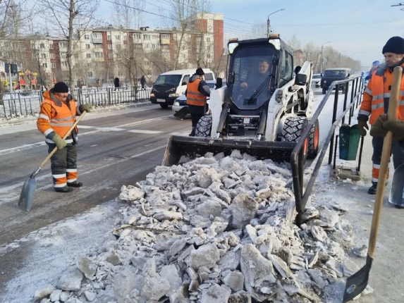 Работа идёт поэтапно: машины-погрузчики вскрывают верхний слой замерзшего снега и грузят его в самосвалы. Там, куда не доходит техника, уборку ведут дворники. Такой же подход применят и на других улицах — Жердева, Революции 1905 года, 502-й километр, в микрорайоне Лазо и других районах.