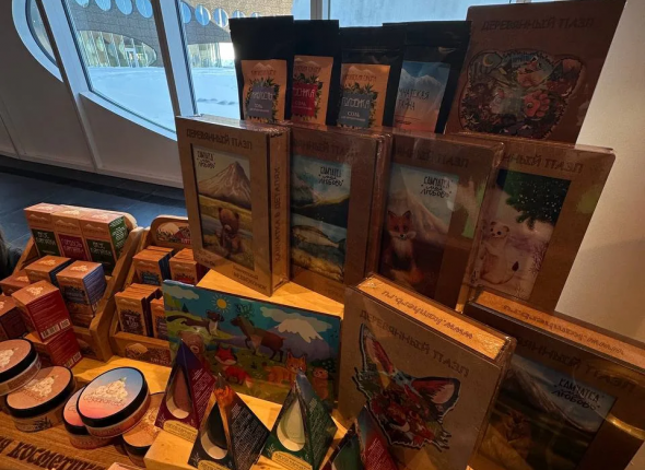 На первом этаже в зоне общего доступа расположились точки продажи сувениров и местной продукции. Здесь же можно приобрести изделия ручной работы от камчатских производителей.