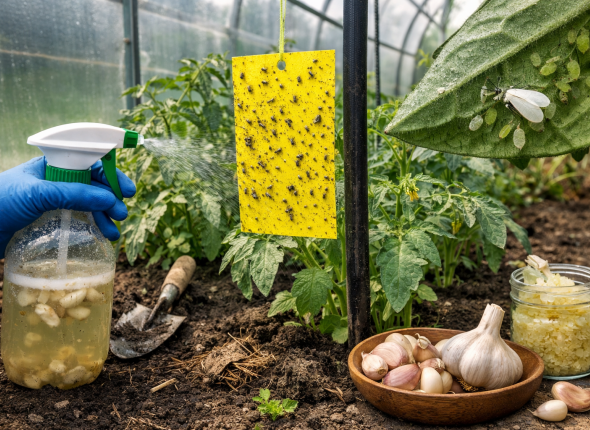Белокрылка и другие насекомые любят летать, а значит, на помощь придут жёлтые липкие ловушки. Развесьте их по теплице, на уровне растений. Эти ловушки отлично привлекают и удерживают летающих вредителей, таких как белокрылка, тля и трипсы. Они не смогут покинуть теплицу, и численность вредителей заметно снизится.