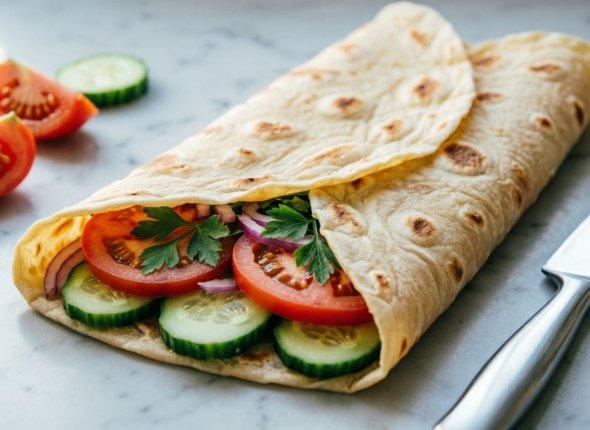 Натрите яйцо и сыр, порежьте дольками томат и огурец, смажьте лаваш творожным сыром. Выложите на край лаваша листья салата, следующей "полосой" — помидоры, далее — огурцы, яйцо и "полоску" сыра. Присолите и сверните в рулет. Оставьте на 1 час в холодильнике. Порежьте на порции перед подачей.