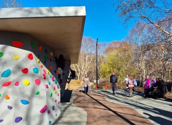 Парк благоустроила компания "Ареал" (бывшая "Хайлэнд Голд") между микрорайонами "Дачная" и "Нижний Горизонт". Уже открыты освещённая тропа, смотровая площадка и скалодром. В этом году работы продолжатся.