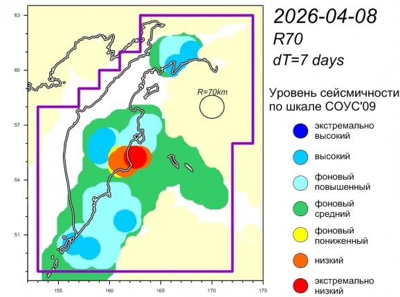 "Уровень сейсмичности Камчатского участка зоны субдукции (по состоянию на 08 апреля 2026 г.) — фоновый средний по шкале СОУС"09",